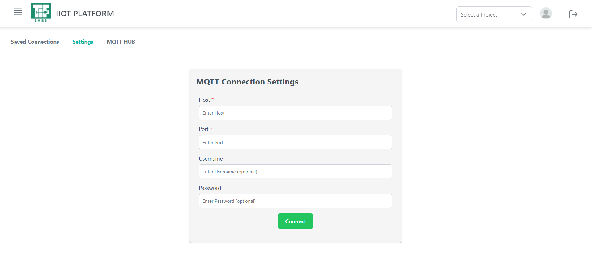 The MQTT Hub offers a robust interface for managing MQTT connections and data exchanges. It features three main tabs: Saved Connections, Settings, and MQTT Hub. These tabs enable users to track connection history, set up new connections, and handle real-time data publishing and subscribing efficiently.
